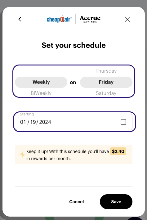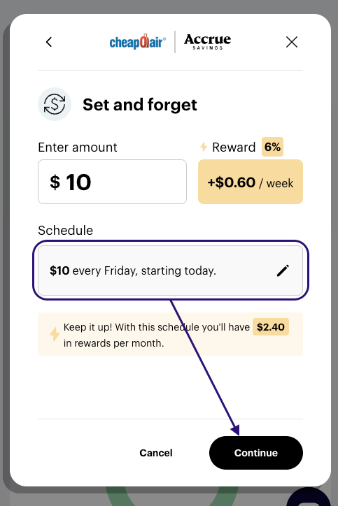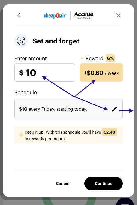 5. Enter the amount you would like to contribute for every deposit, you will see the rewards earned for each deposit. Then click the pencil icon to choose how often.
