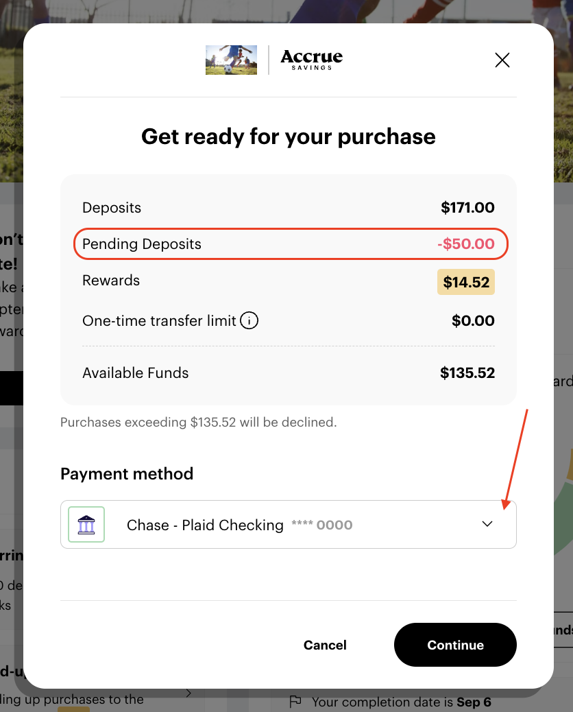 4. Choose the payment method you would like to withdraw from in the event your purchase goes over the saved amount then click "Continue"
